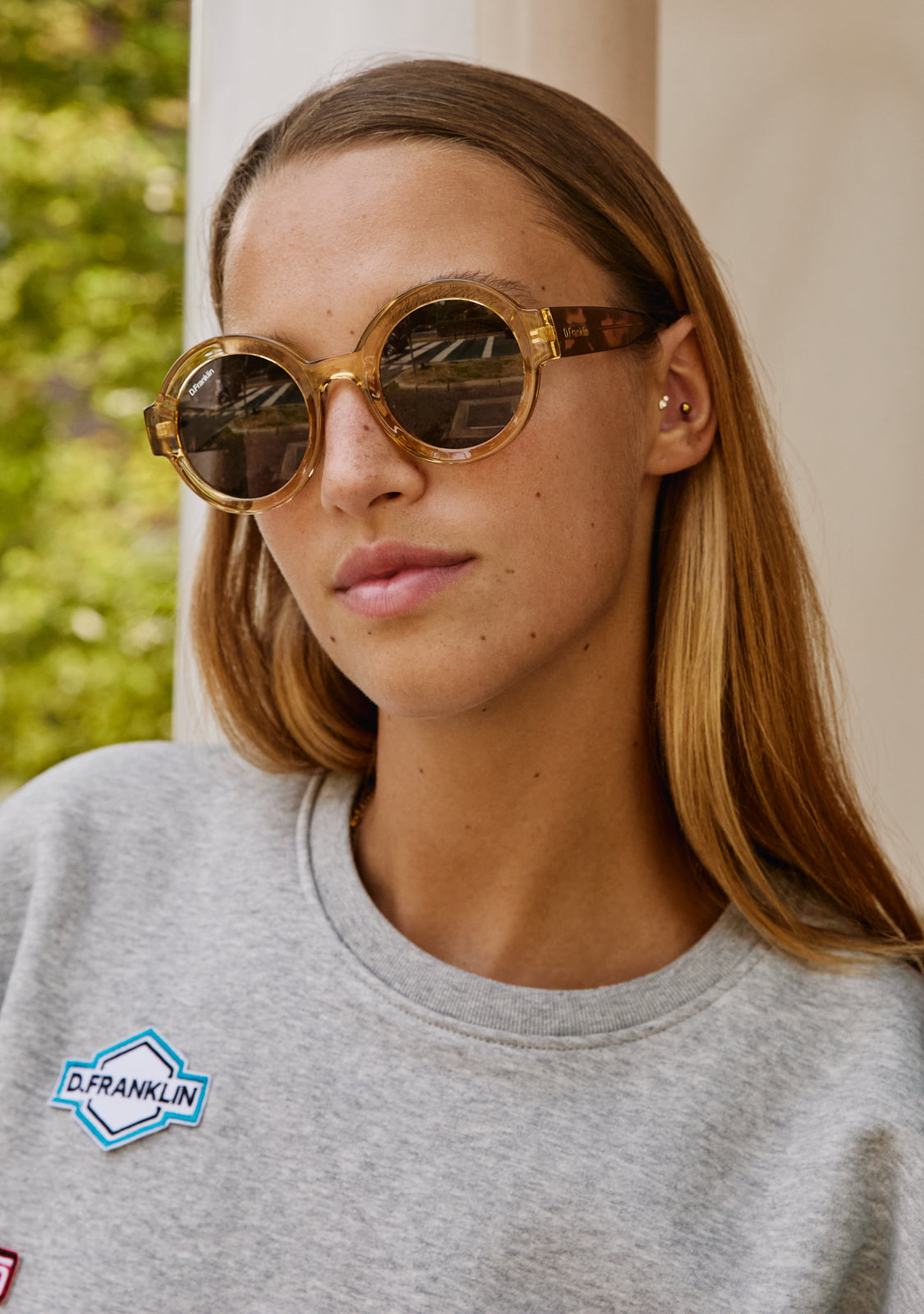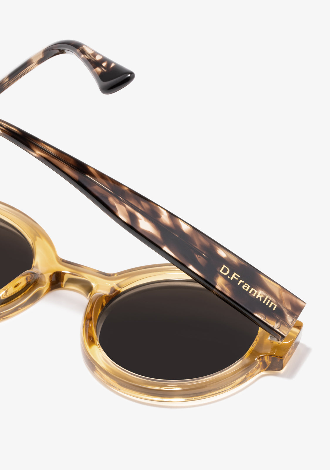 Round-frame sunglasses with a transparent finish in brown tones. A distinctive piece for your most daring outfits.
