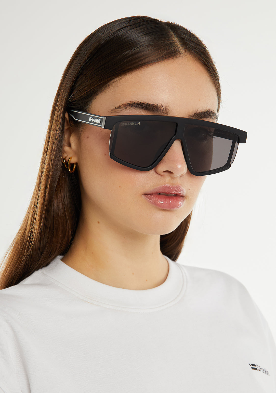 Black tinted polycarbonate lenses and a dark-tinted frame highlight the uniqueness of this model. Featuring our signature D.Franklin details: engraved logo on the temples and emblem on the right lens. With a lens width of 65.5mm and a 152mm front frame, these glasses will flatter most faces. The side temples are 150 mm long.