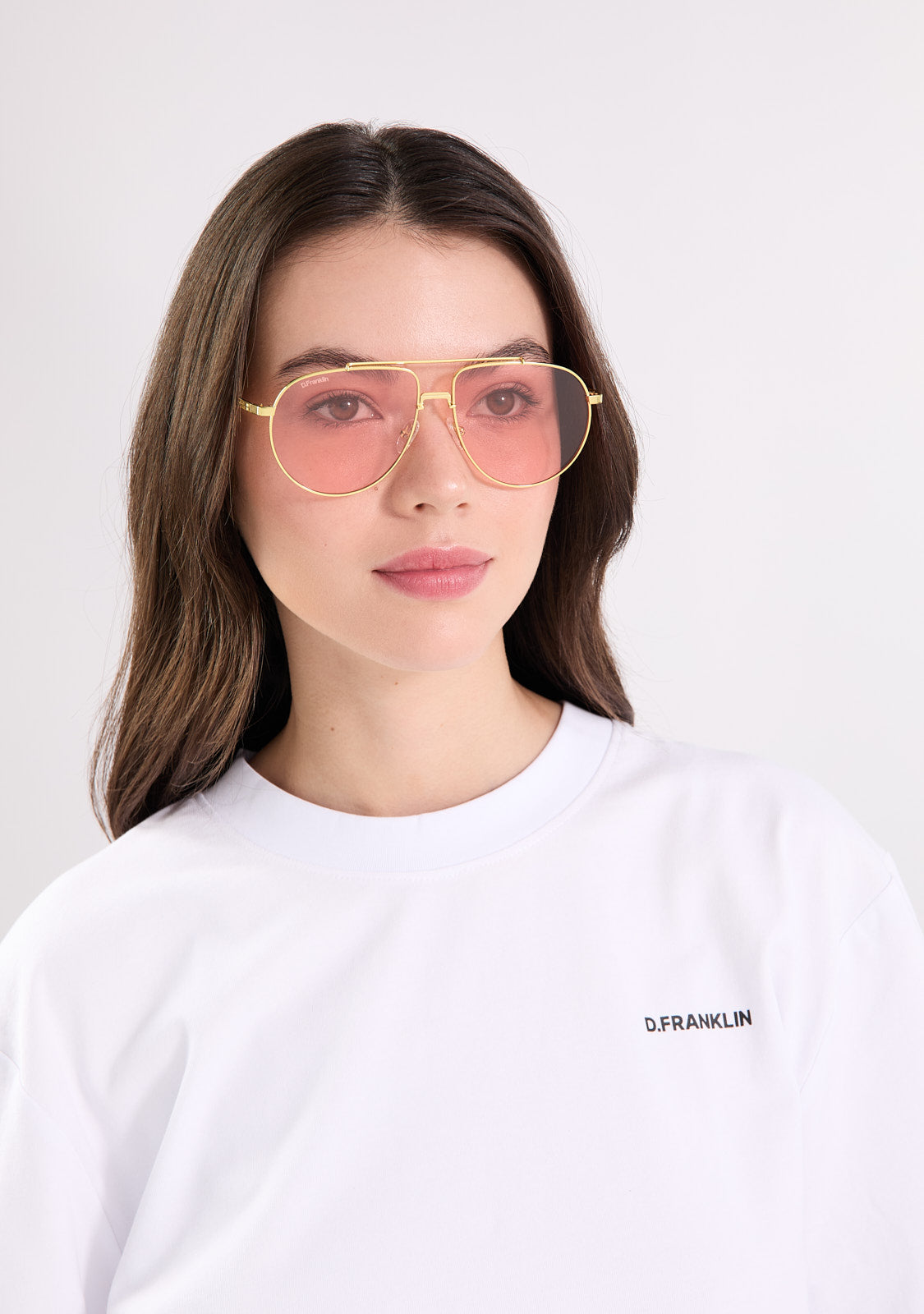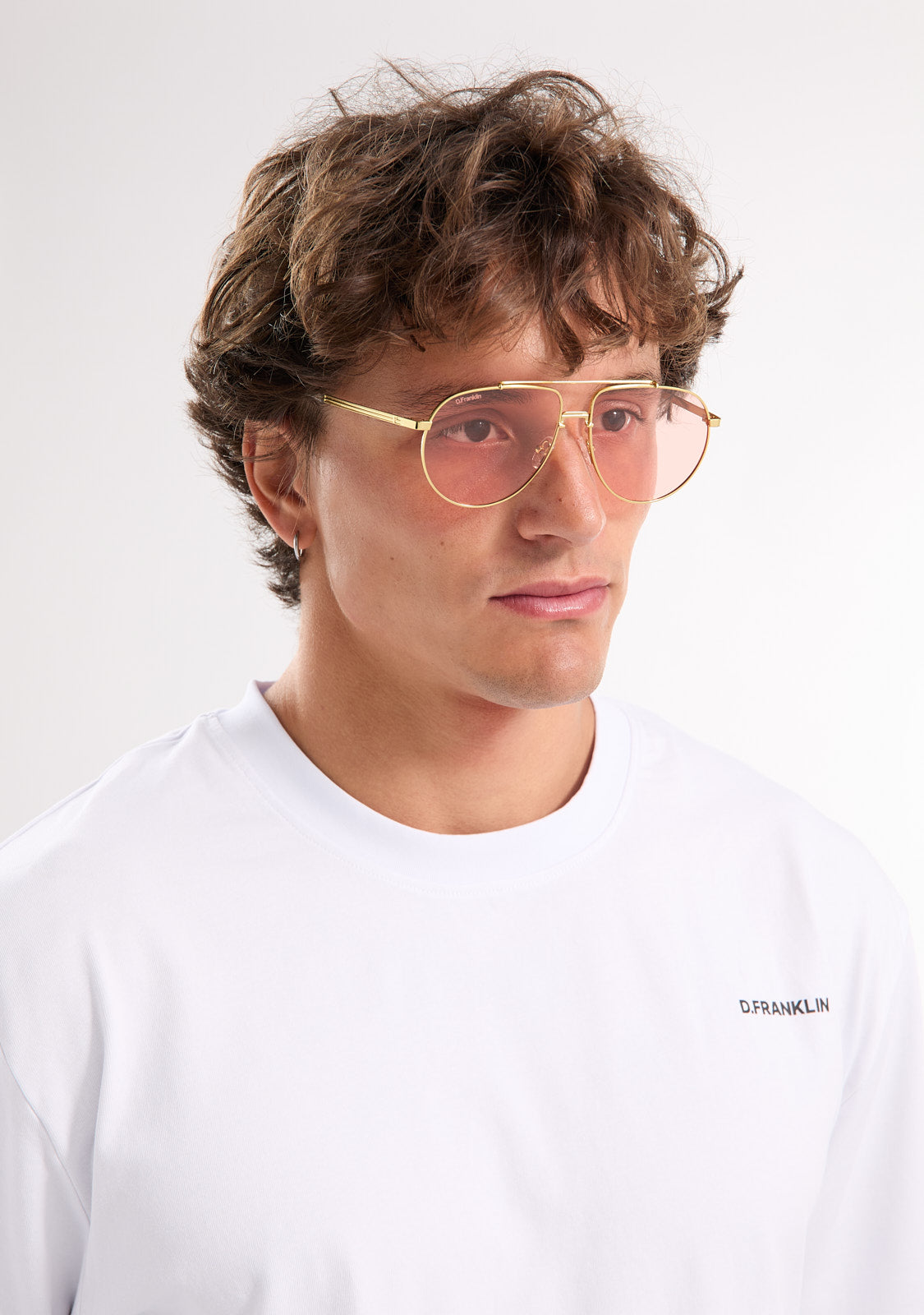 The Aviator Legacy Gold / Photochromic Red by D.Franklin combine classic design with advanced technology, offering a unique sunglasses experience. The frame, bridge, and temples are made of durable metal, ensuring a comfortable fit for various face shapes.