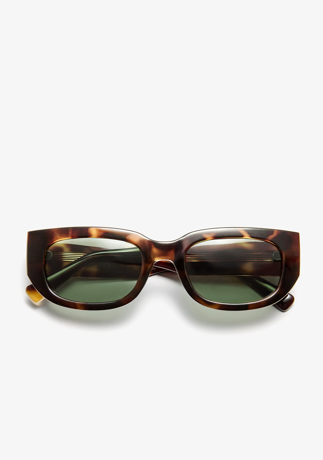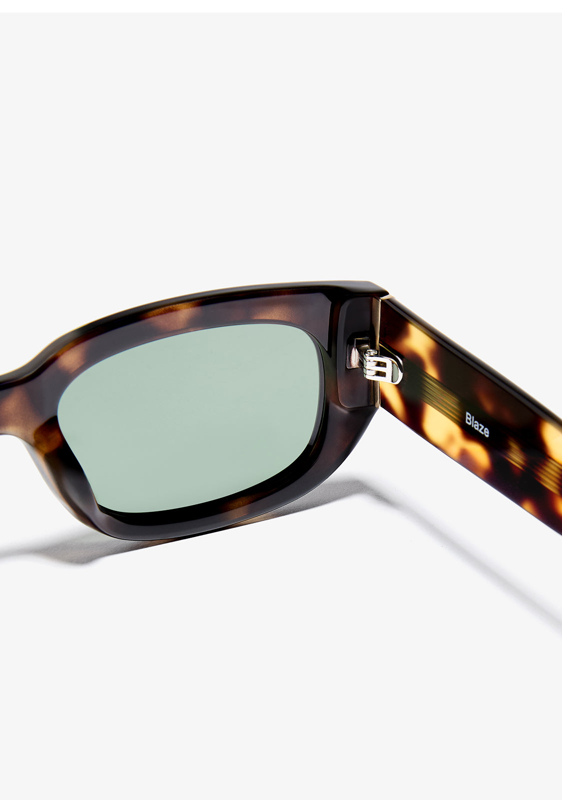 The Blaze Tort / G15 sunglasses feature a bold rectangular silhouette with a sleek tortoiseshell frame and green lenses. Inspired by retro shapes and refined with clean lines, they add a confident edge to everyday looks.