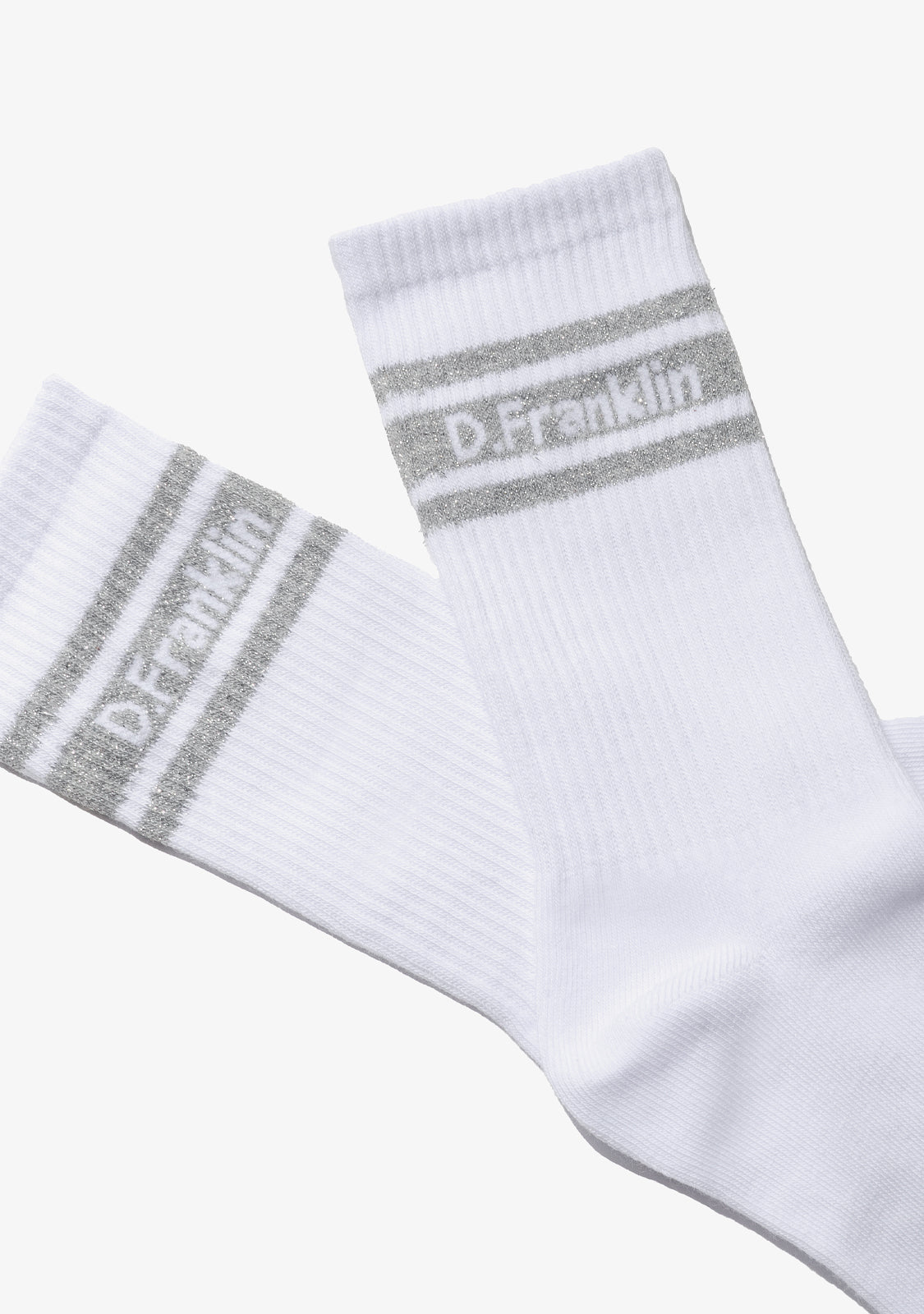 A three-pack of comfortable, versatile socks perfect for everyday wear. The DF 3 Glitter Stripes Socks 3 Pack White features a design with three lurex stripes, adding a modern touch to any outfit. With a high calf length that fits smoothly around the foot, they offer secure support without feeling tight.