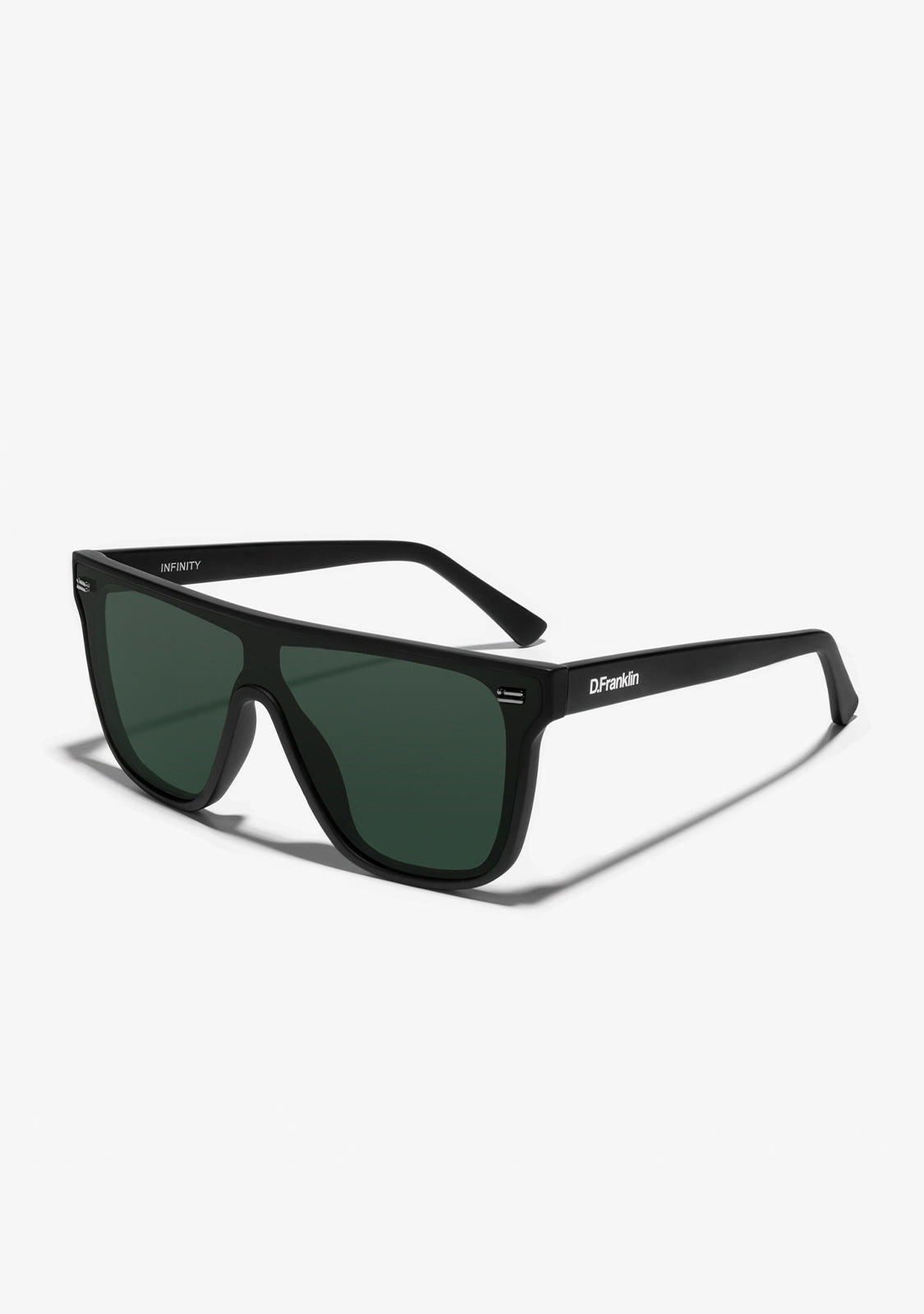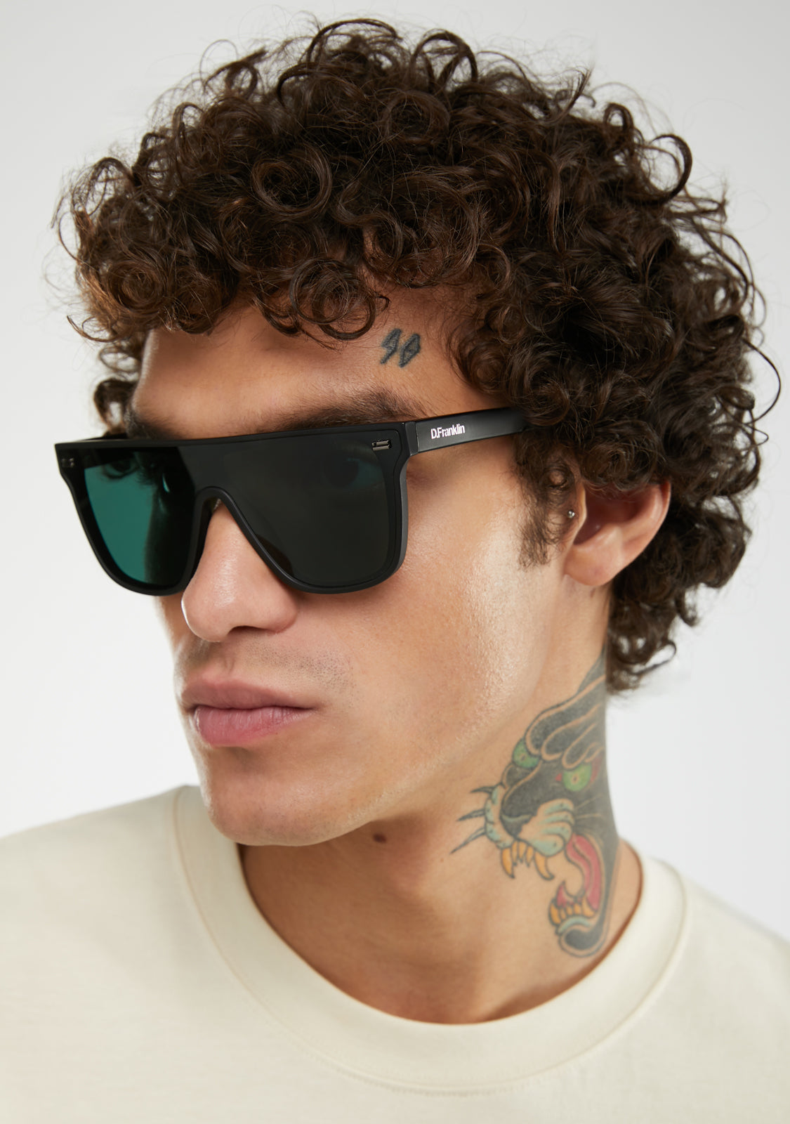 Dark green polycarbonate lenses and black contours define the essence of its features. It features our signature D.Franklin details: the logo engraved on the front left and right sides and our emblem on both temples. With a 140mm lens width and 144mm front frame, these glasses enhance the features of any face. The side temples are 149mm long and are made of hypoallergenic and resistant materials.