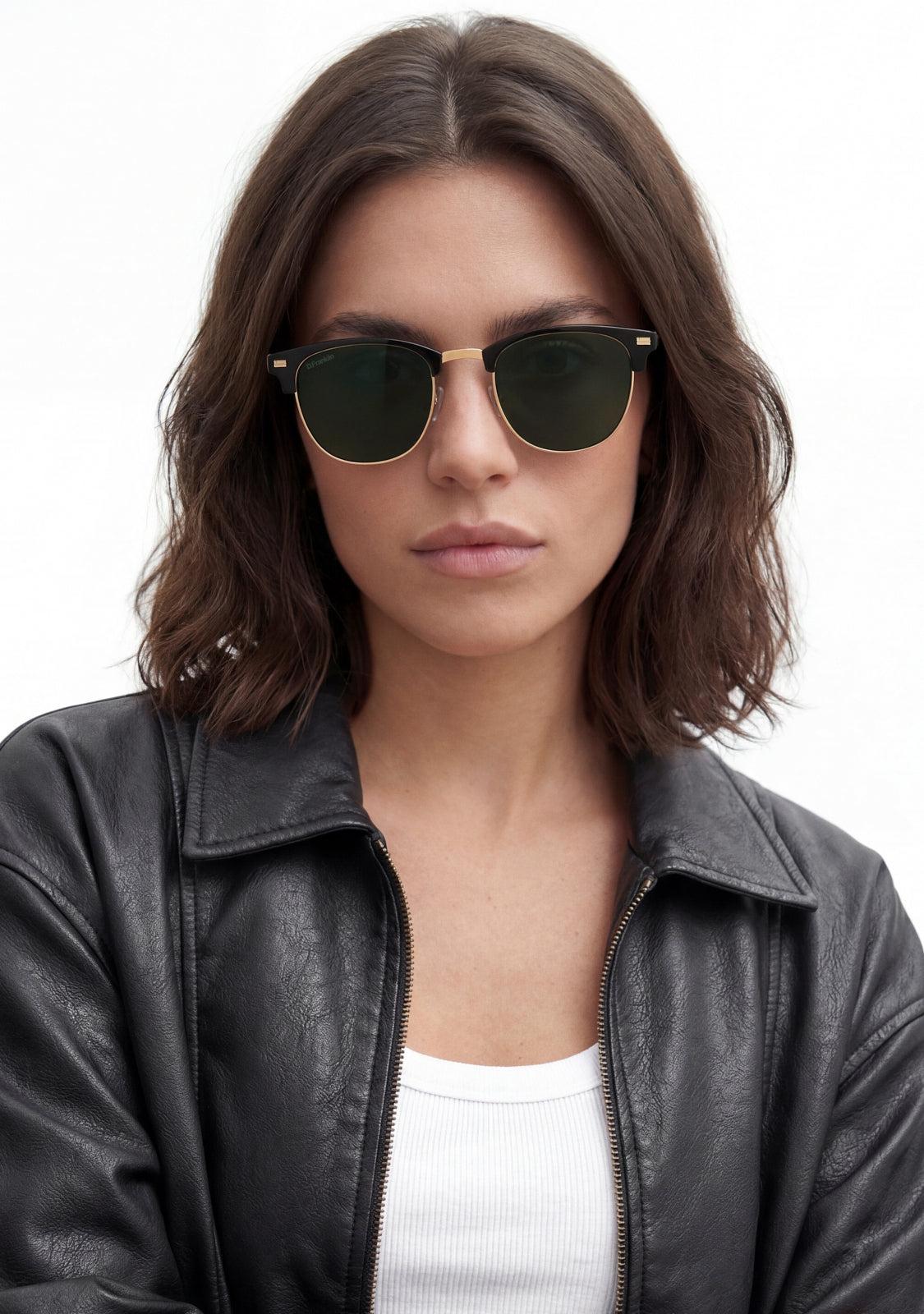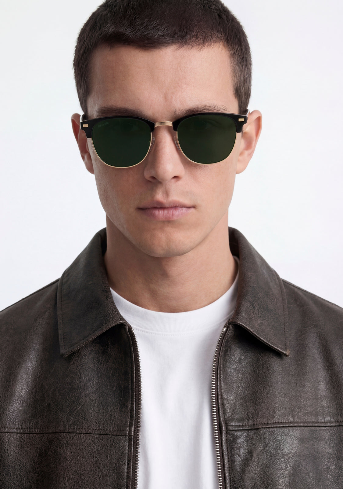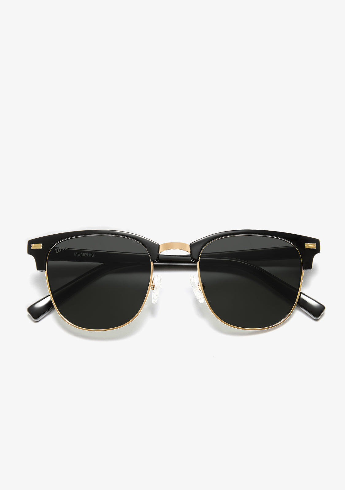 Memphis in Black is a retro-inspired silhouette updated with clean, modern lines. Finished with signature D.Franklin touches, including the logo engraved on the temples and the emblem on the lens.