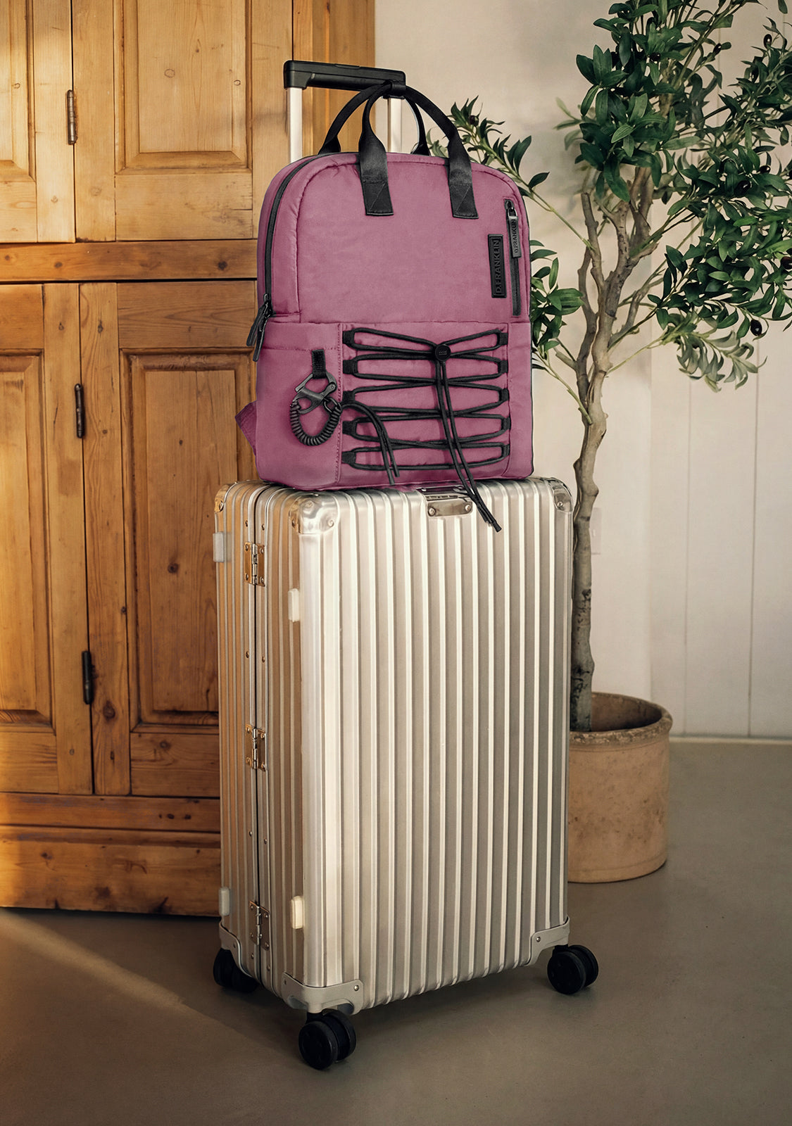 On the outside, it has two side pockets perfect for storing items such as a bottle or umbrella. In addition, it has two other small zippered pockets: one on the upper front and one on the back. On the same back, there is also a nylon strap with D.Franklin lettering designed to be attached to the bag. Interchangeable front drawstrings with metal stopper and our flag emblem and top zipper closure with handle trim.