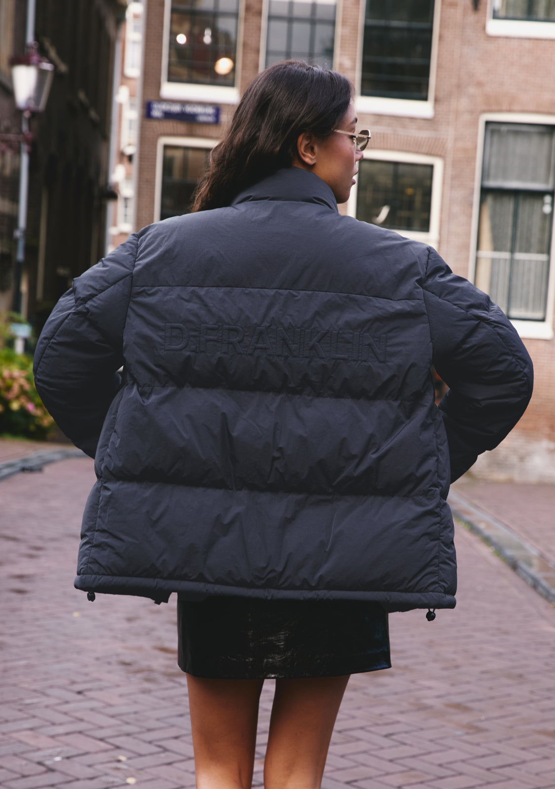Navy puffer jacket. A quilted piece for your cold-weather outfits.
