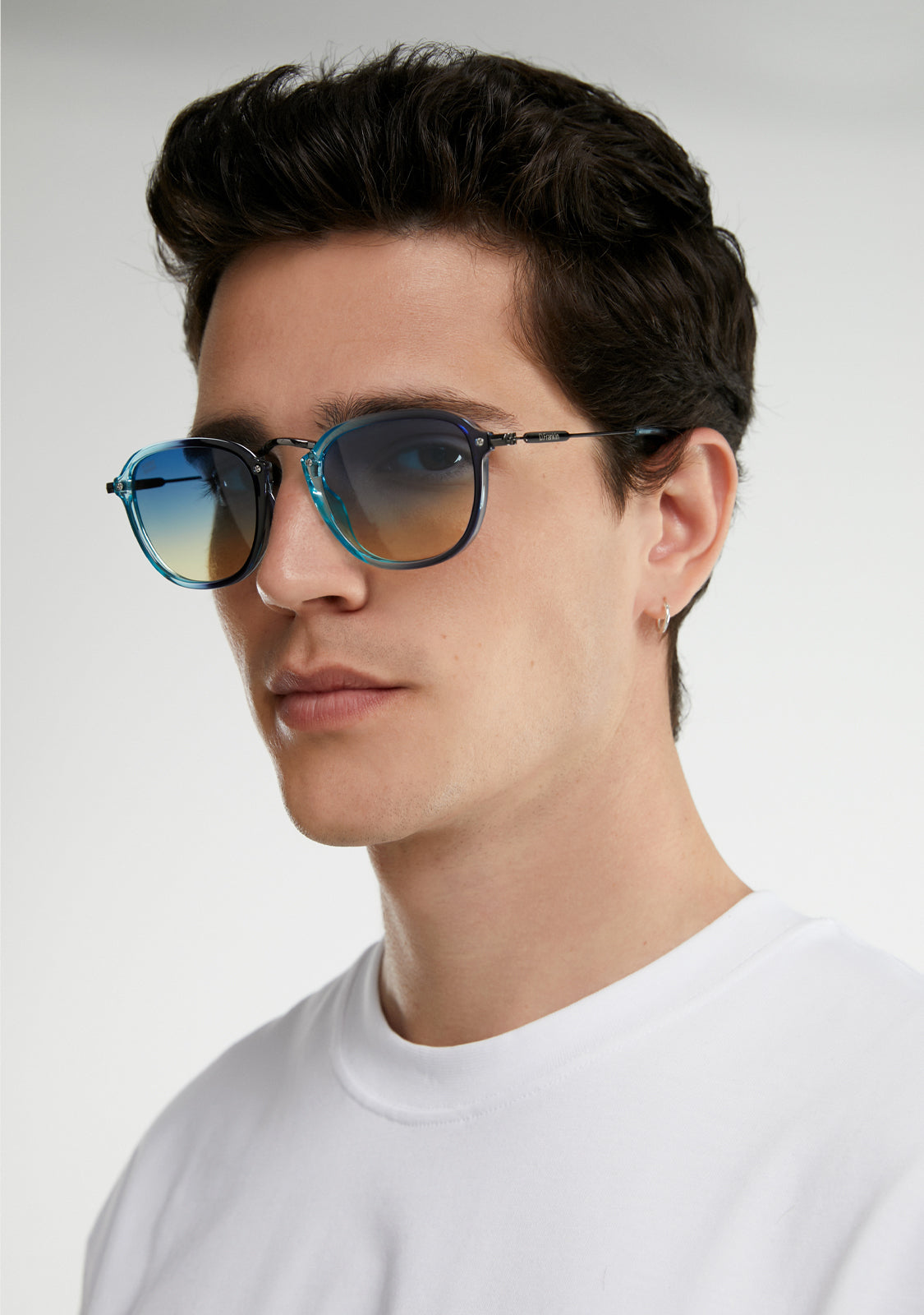 The polycarbonate lenses feature a smoky blue tint on a square-framed metal silhouette. It features our brand's signature details: the logo engraved on both metal temples and our emblem on the right lens. With a lens width of 51 mm and a 147 mm front frame, these glasses enhance the features of any face. The side temples are made of stainless steel and have a length of 145mm.