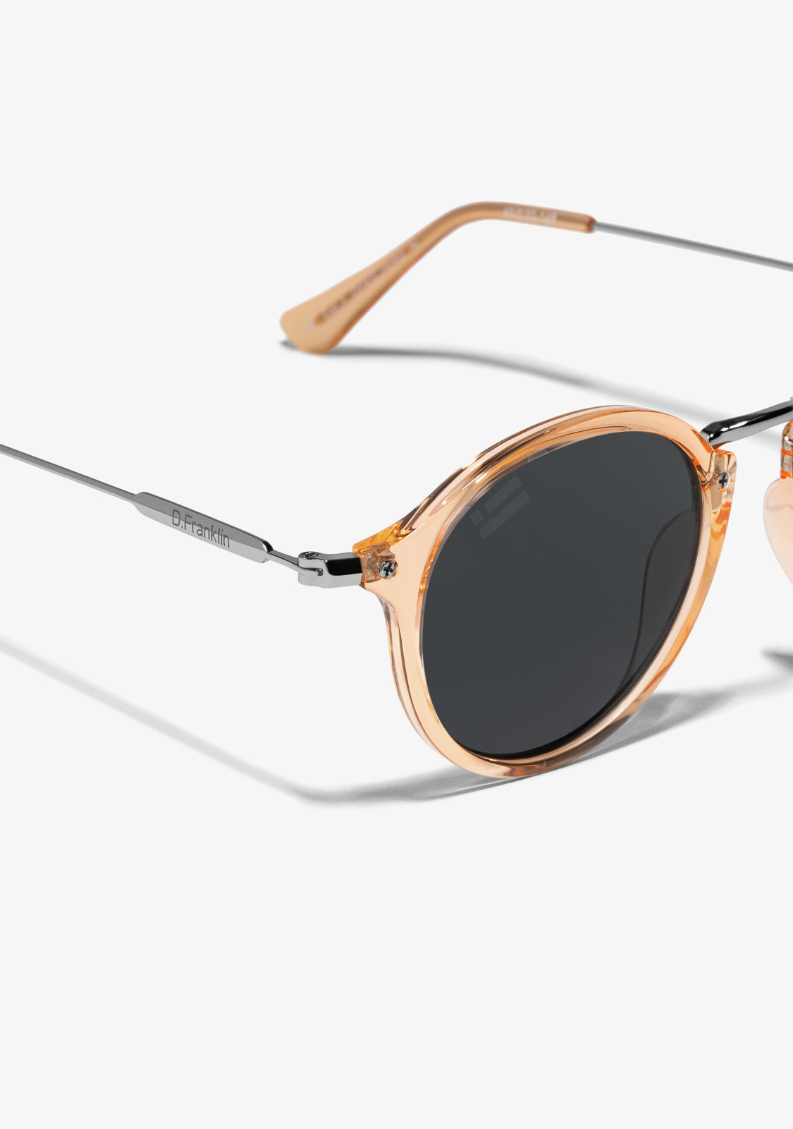 Rounded grey tinted lenses and an amber frame reinforce the seventies aesthetic of this model. It features our signature D.Franklin details: the logo engraved on both metal temples and our emblem on the right lens. With a lens width of 49mm and a 148mm front width frame, these glasses will flatter most faces. The side temples are 145mm long.
