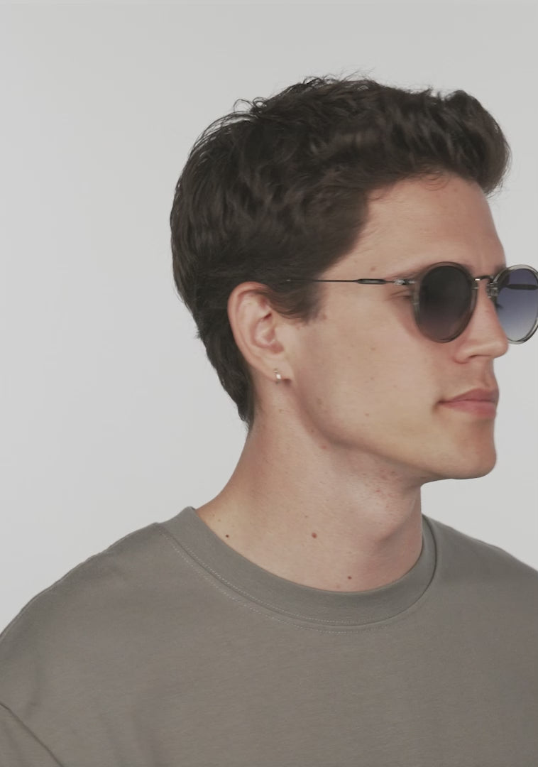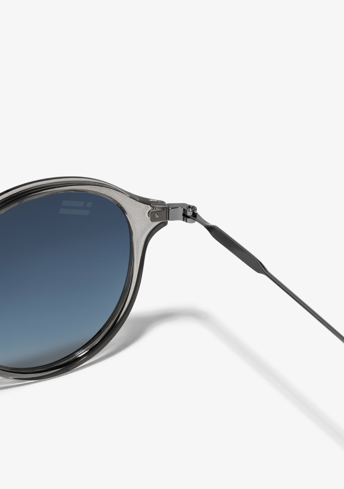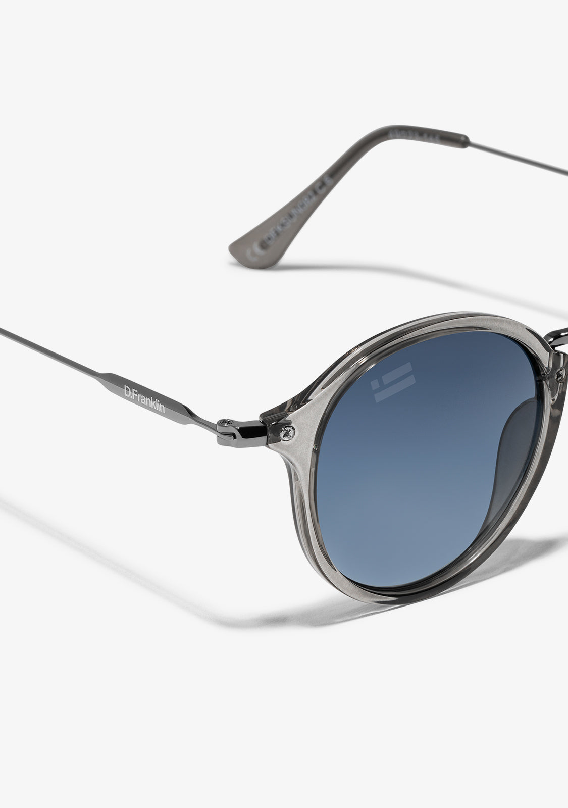 Rounded blue smoked lenses and a grey frame reinforce the classic aesthetic of this model. It features our signature D.Franklin details: the logo engraved on both metal temples and our emblem on the right lens. With a lens width of 49mm and a 148mm front width frame, these glasses will flatter most faces. The side temples are 145mm long.