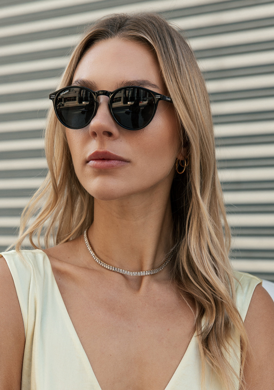 Black polarized lenses and a dark frame create a clean finish. This design features a metallic D.Franklin logo on both acetate temples and our emblem on the right lens. With a 137mm front frame and 50mm lens width, these glasses will flatter most faces. The side temples are 145mm long.