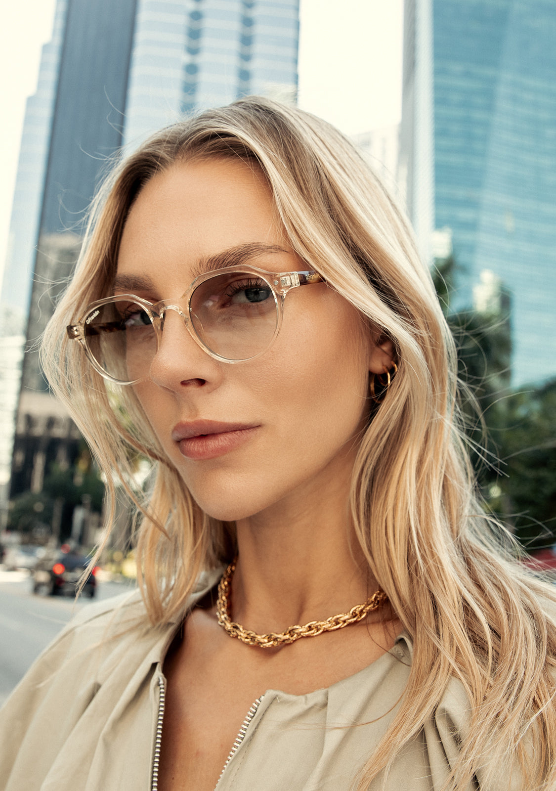 Its round, smoked gray lenses and transparent TR90 frame highlight the timelessness of this model, with a different touch. It features our distinctive D.Franklin details: the logo engraved on both metal temples and our emblem on the right lens. With a lens width of 47 mm and a front frame of 138 mm, these glasses flatter most faces. The side temples have a length of 145 mm.