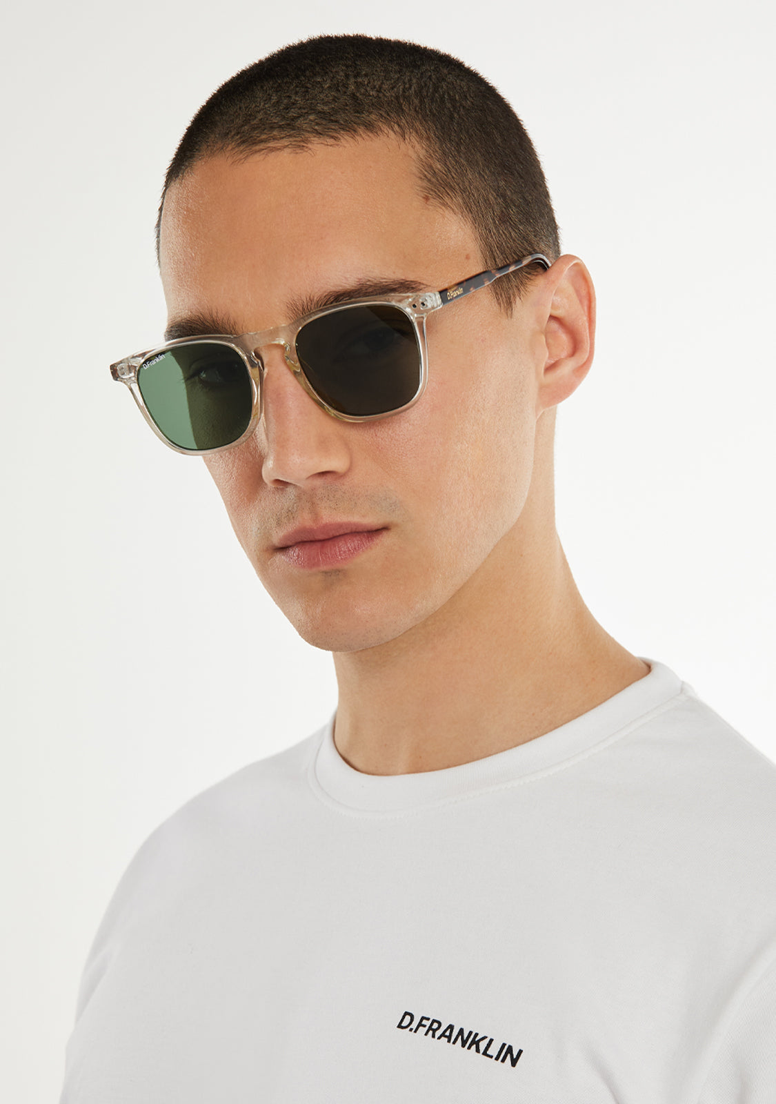 Our Ultra Light SQ High model with a transparent finish features our signature D.Franklin details: logo engraved on both temples and our emblem on the right lens. The lens width is 52 mm and the front is 144 mm. Side temples are 145 mm long.