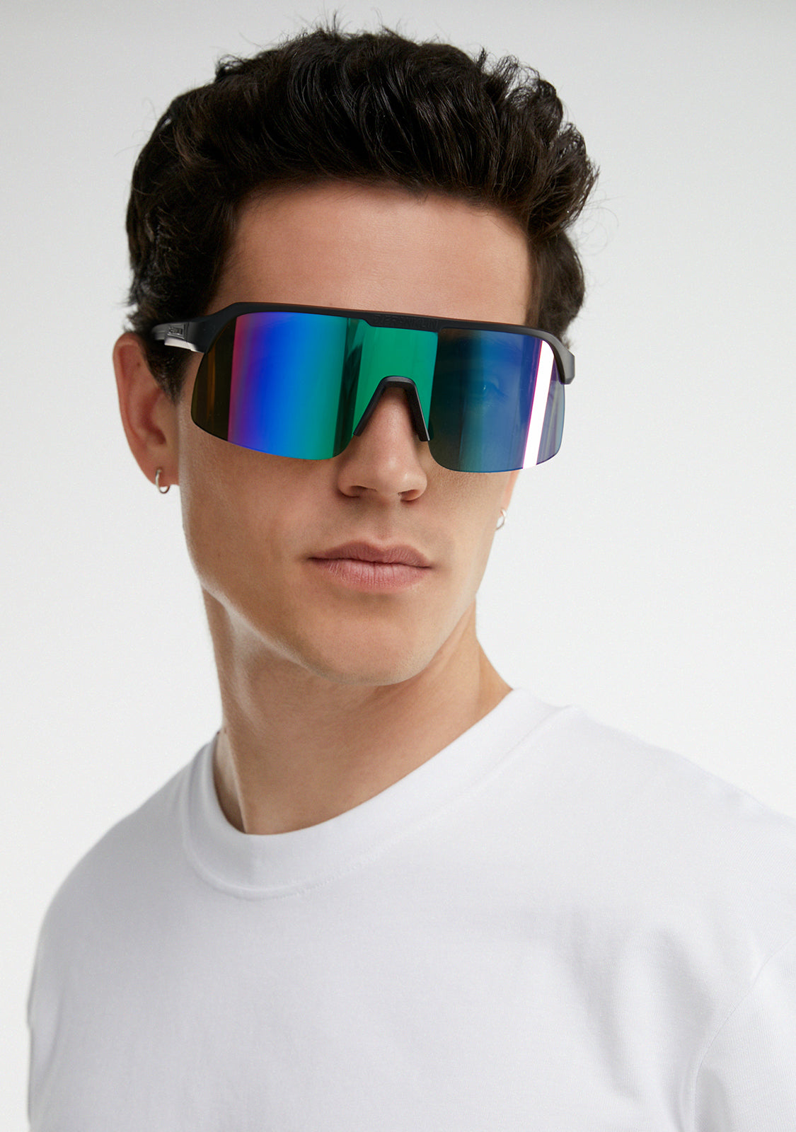 Designed with performance in mind, the new Wind collection by D.Franklin gives you a bold and versatile look that you can confidently wear everywhere. Unmistakable sports sunglasses, created with high quality materials and superior lightness. The Wind Fifty Black / Green model guarantees maximum protection and comfort thanks to its panoramic lenses and silicone nose pads.