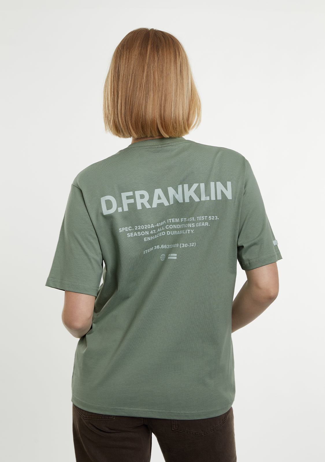 This short-sleeved green t-shirt with a round neckline features the D.Franklin logo on the upper left side in white contrast. Additionally, the back has an exclusive design in the same colour.